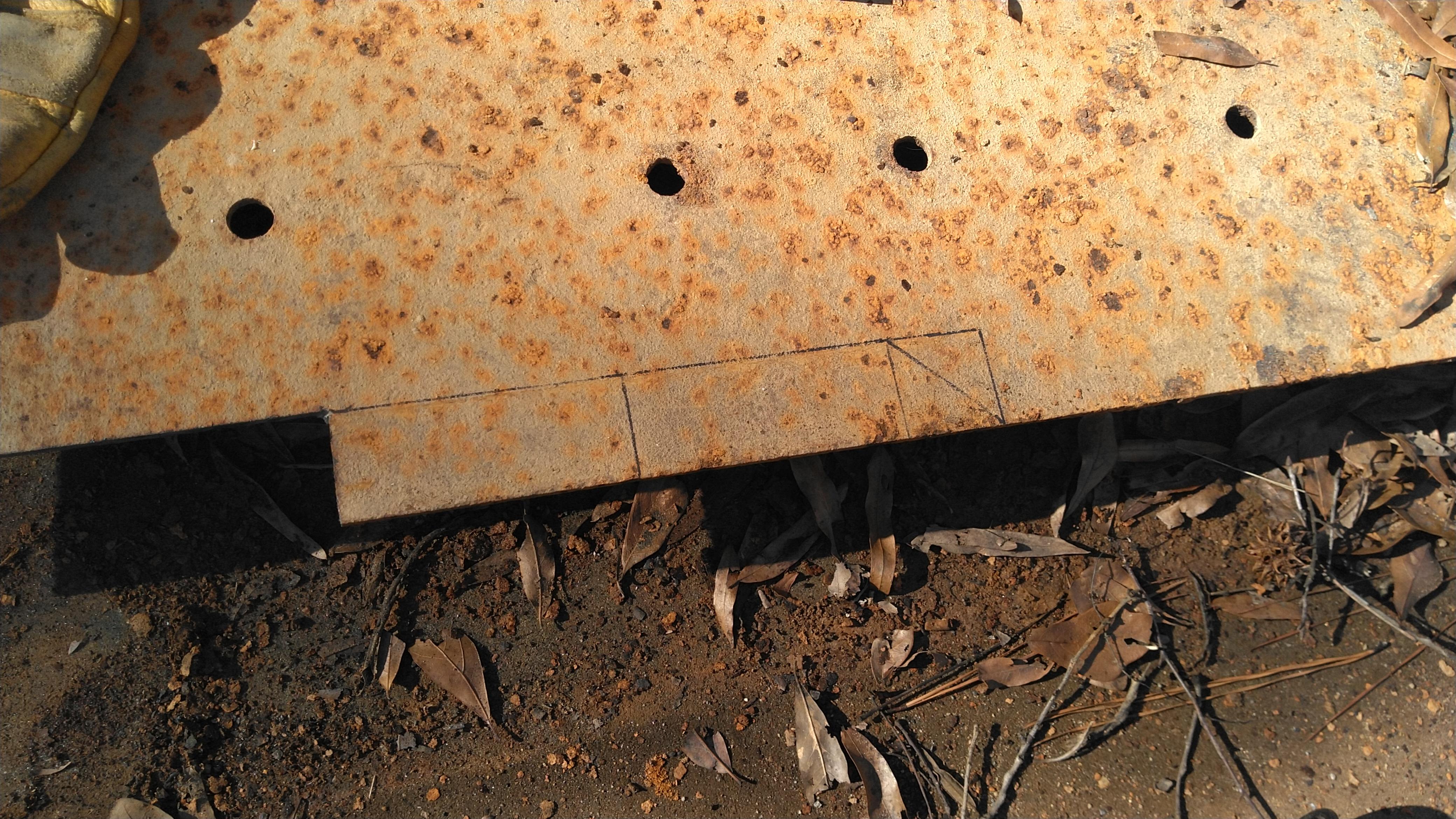 It needed quite a bit of cleaning up with all the rust scale, but here it is with all the corners chamfered, most of the rust wire wheeled off, and the two mounting holes drilled ten inches apart to match the lawnmower. You'll notice the center line drawn to indicate where the other pieces will be mounted.