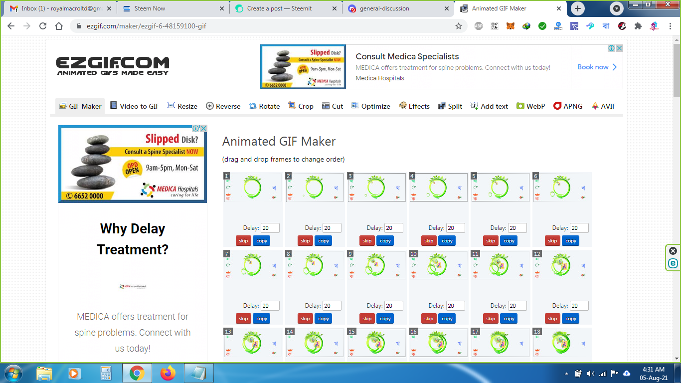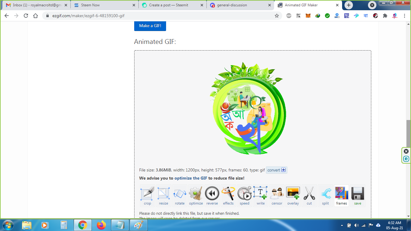 মূল কাজ শেষ, এই বার একটি ওয়েব বেসড GIF Maker সাইট এ আমাদের এই ৬০টি ফ্রেম দিয়ে মুহূর্তের মধ্যে একটি gif বানিয়ে ফেললাম । তারপরে ডাউনলোড করে নিলাম, ব্যাস কাজ শেষ ।