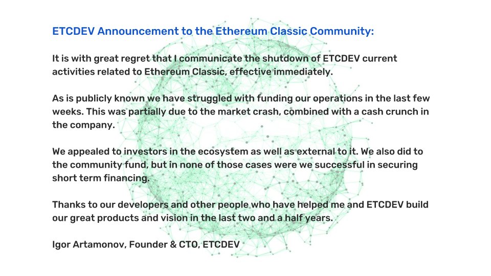 “Unfortunately ETCDEV cannot continue to work in the current situation and has to announce shutdown of our current activities”