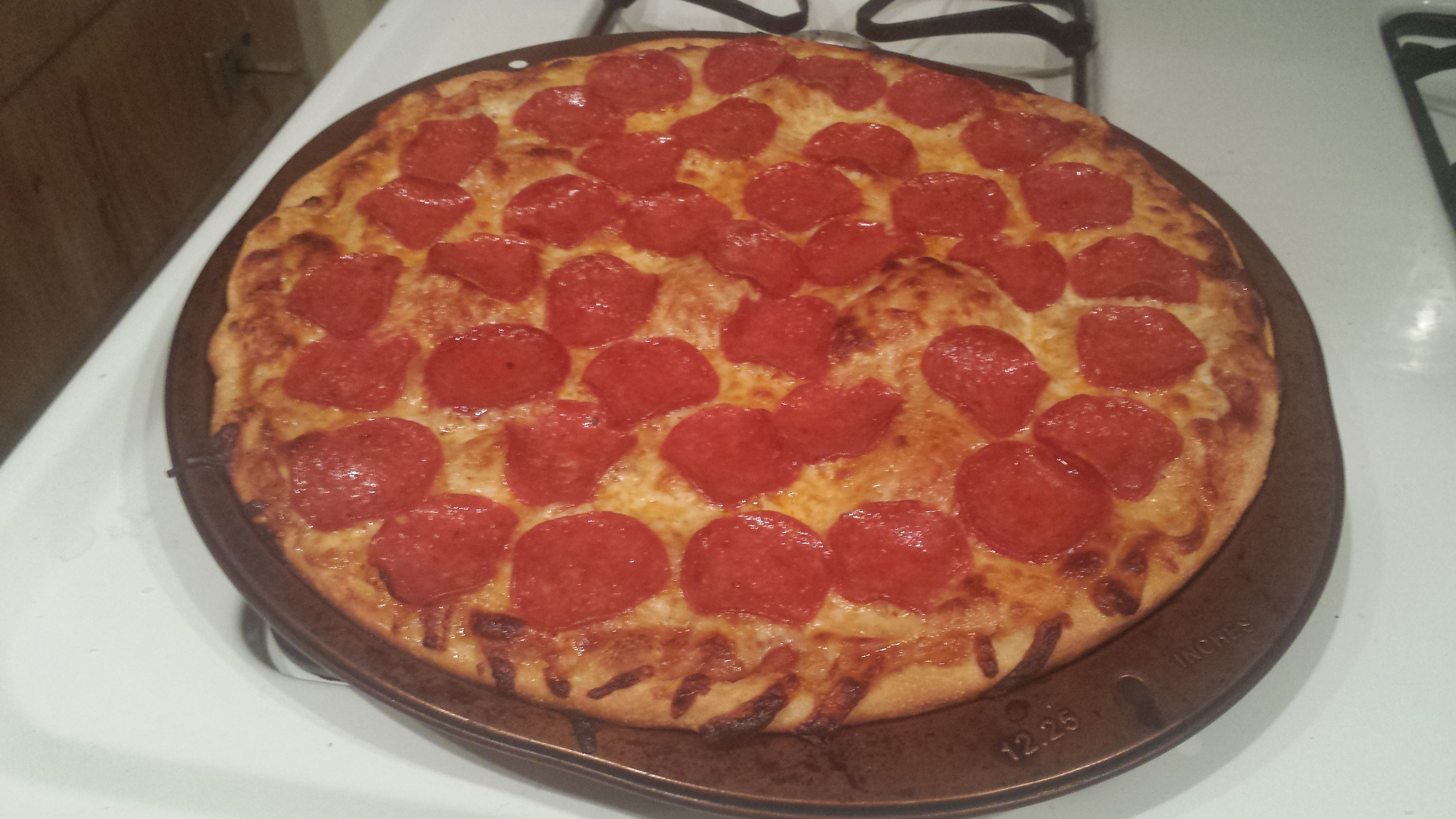 เมื่อเตรียมทุกอย่างพร้อม แผ่แผ่นแป้งพิซซ่าลงในถาดพิซซ่า นวดๆแป้งให้เข่ารูปทรงถาด จากนั้นนำซอสพิซซ่ามาทาให้ทั่ว ไม่มากไป ไม่น้อยไป ถ้าซอสมากอาจทำให้แป้งไม่กรอบ อันนี้ในกรณีคนที่ชอบกินแป้งกรอบๆ แนตจะใส่พอประมาณค่ะ พอดีๆ...โรยชีสลงไปให้ทั่ว ขั้นตอนนี้เต็มที่เลยค่ะ ใครชอบชีส รักชีส โรยไปเต็มๆ นำเปบเปอร์โรนีมาแผ่บนชีส เป็นอันดับสุดท้าย ...แค่นี้เองค่ะ จากนั้นก็นำไปอบที่ 450 ฟาเรนไฮต์ เวลา 15 นาที ...เมื่อครบเวลาที่ตั้งไว้ เปิดเตาดูว่าอยากได้ให้มันกรอบกว่านี้ไหม เพราะบางที แป้งยังไม่เป็นน้ำตาลเข้มตามที่ชอบ เพิ่มเวลาได้อีก 2-3 นาที เป็นอันเสร็จ ...เราก็ได้พิซซ่าที่ทำง่ายที่สุดในโลกแล้วค่ะ ง่ายที่สุดในโลกและอร่อยมากที่สุดในโลกด้วย ฮ่าๆๆ... คอนเฟิร์มบาย (สามีหม่อมถแนตศรี...)