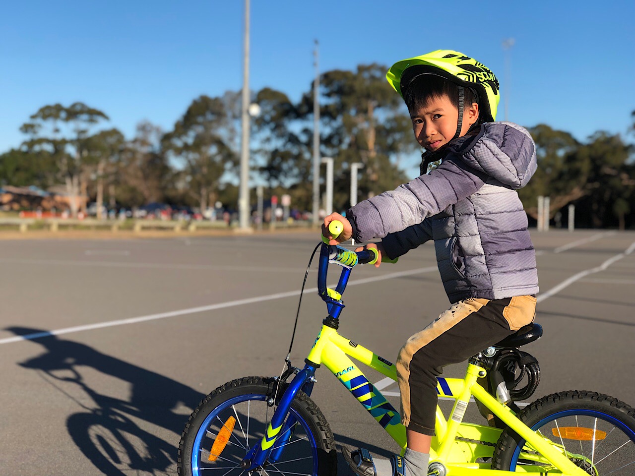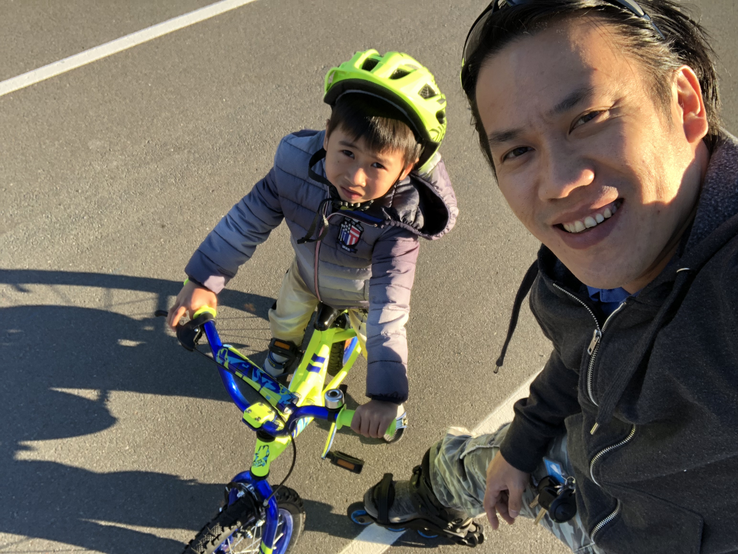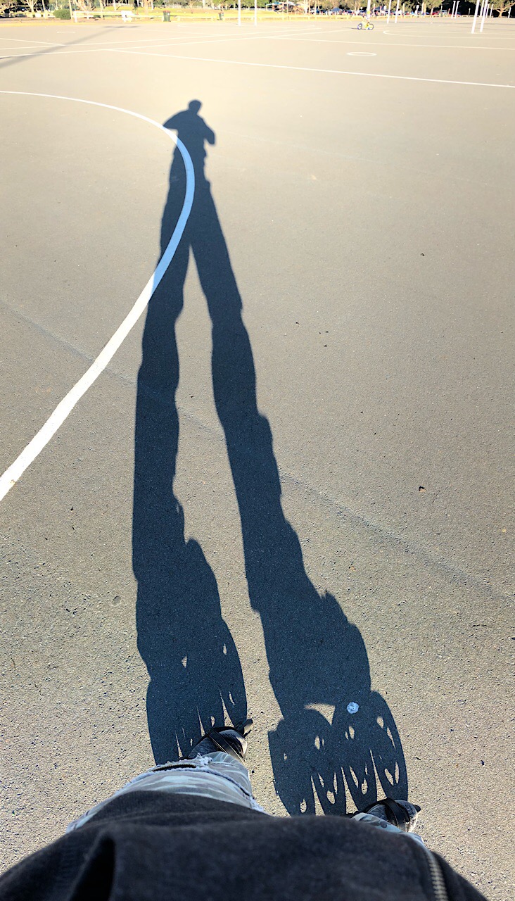 Arrivés au parc, on profite du soleil qui réchauffe la peau. C’est super. Le petit fait ses tours en vélo pendant que je le suis sur mes rollers pour filmer cette vidéo.
