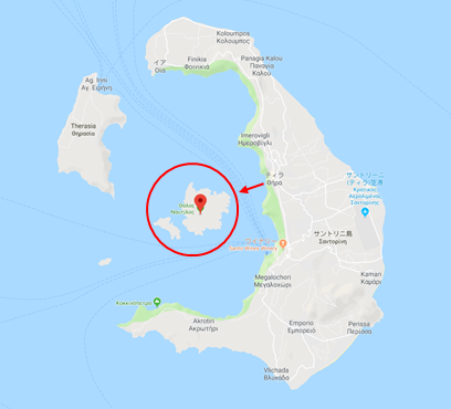カマリ火山と呼ばれる火山で、サントリーニ島に囲まれるように中央に位置していま。