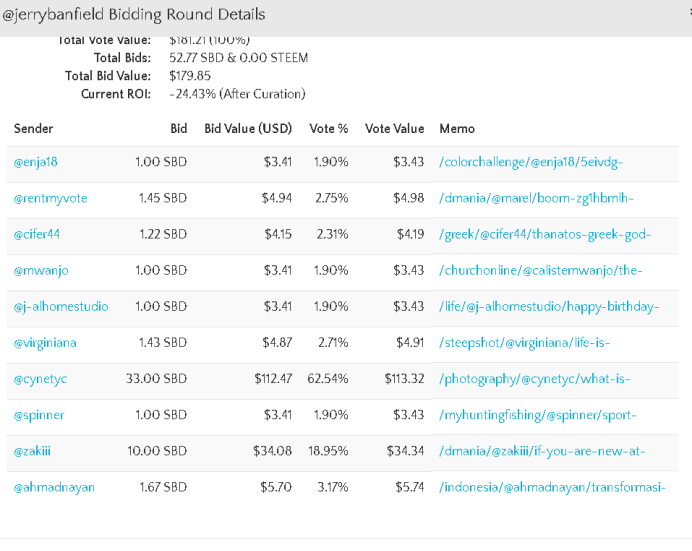 Hi @zakii, I am not a bot but I am obsessed with the bidbots, so I watched the action that is happening at the steembottracker. I noticed that you have put in a bid for Jerrybandfield when the max suggested bid was already 0 & the ROI was already negative. This has caused everyone who bid earlier than you to get a negative ROI as well. It could be possible that you are not very aware of the ROI (turning negative) and the zero Max suggested bid. At the point of writing, the next vote for jerrybandfield is 17 min 42 seconds away.