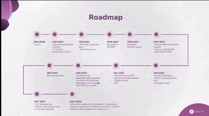 We launched the very first app chain on the octopus network tested in May with getting 250k of state funding. We are gathering our strategic round now, while hard work at code to do Doctor onboarding, July, we are developing our privacy computing data marketplace while going to private drop token generation event. August, we come into an ideal, I love to watch ******. Kilt development follows, ensuring that the lab consortium governance is set up, and we plan to launch main net in the octopus network by October 2021 After stabilisation of the network, we will develop the data tokens further to increase data granularity, expand markets and partnerships further and explore b2b implementations of our next of our platform.
