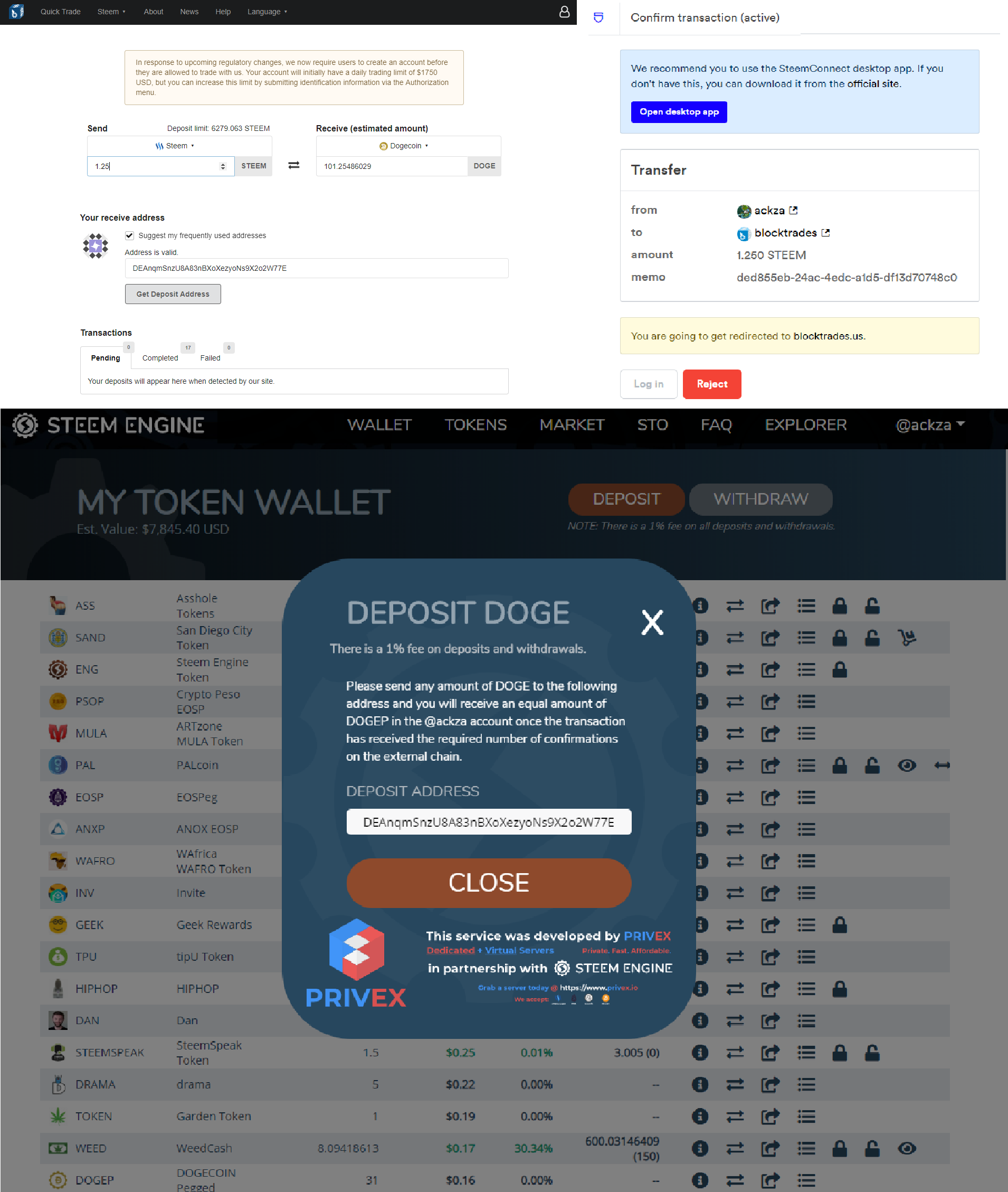 Depositing Dogecoin from Blocktrades into my steem-engine.com account allowing for arbitrage all using steemconnect or keychain. Arbitrage "buttons" could streamline the process.