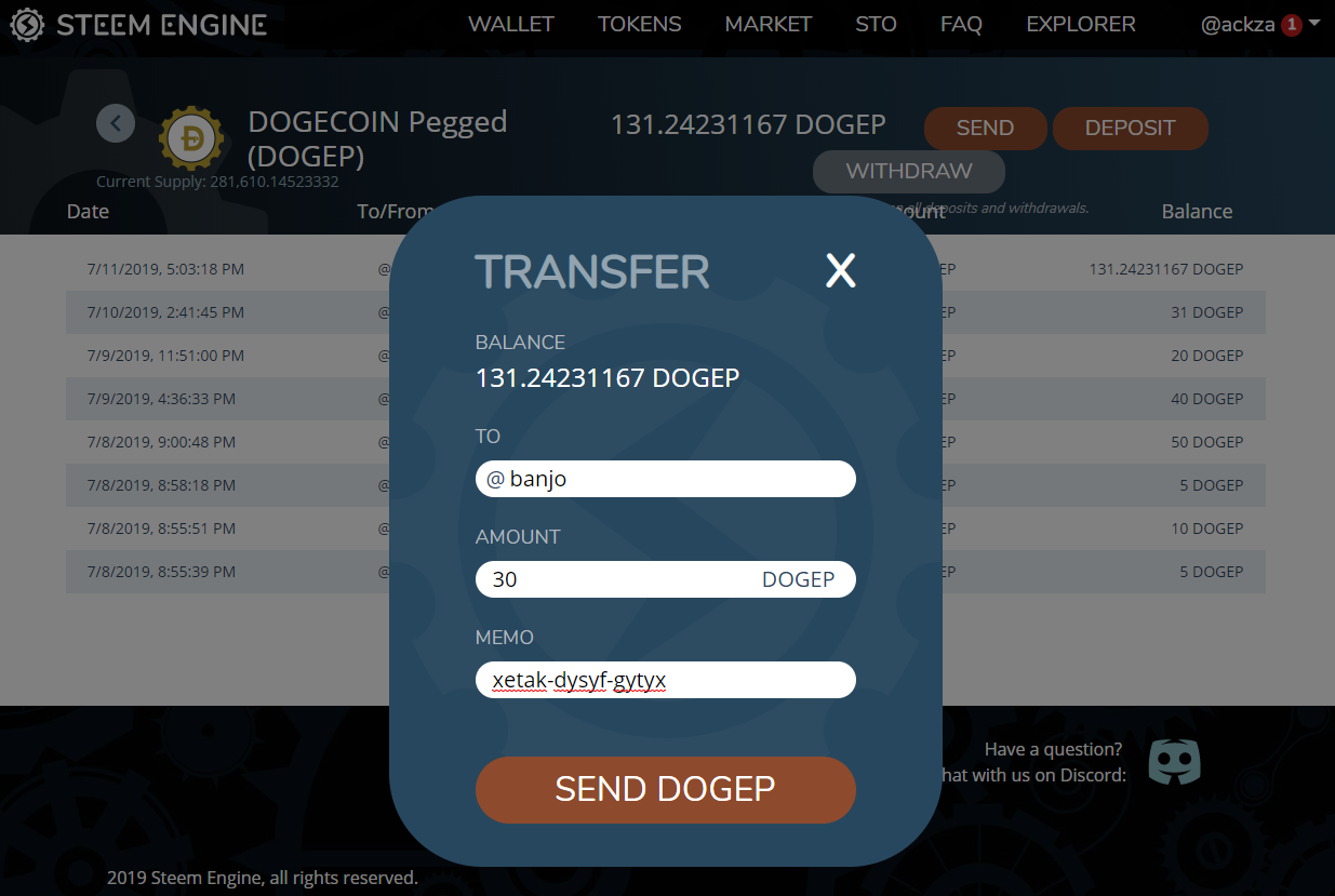 And here is the depositing of my Dogecoin tokens to the @banjo bot which holds them on discord so I can tip them to people's discord OR steem withdraw