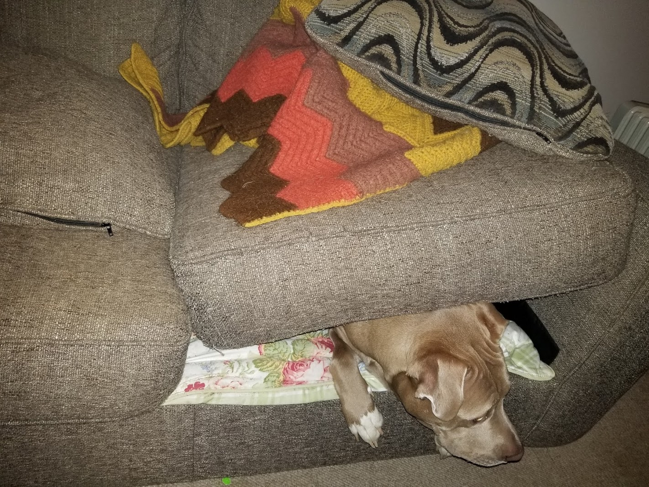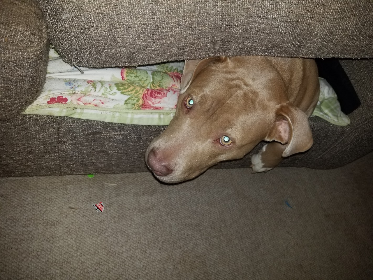 @patrice brought this foundling home named Lucy! She thinks she owns everything! Here she is messing up my couch!