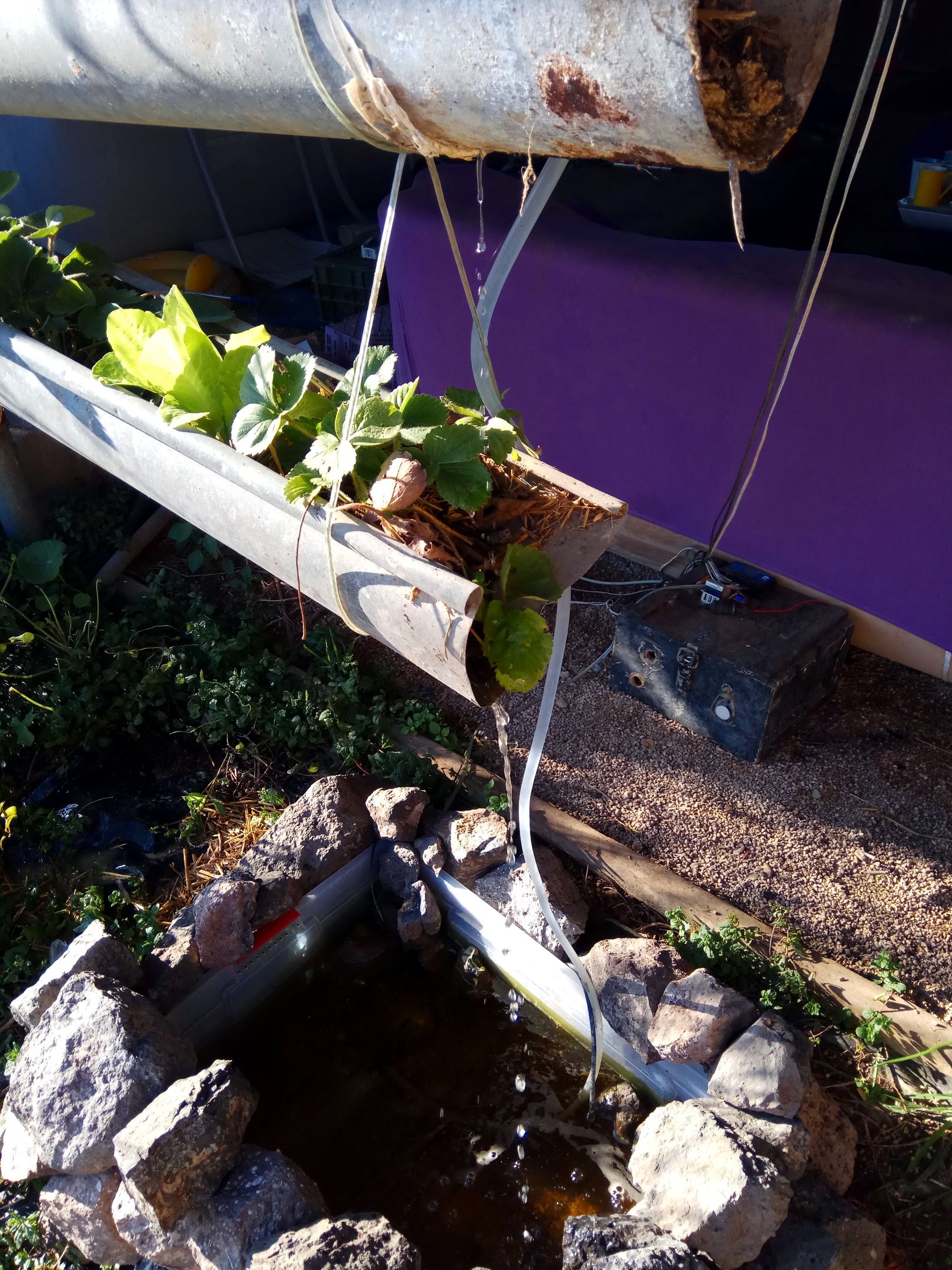 The idea is that the water go back to the pond, where the fish live and poop, fertilizing the plants growing on top, and creating a symbiotic system.