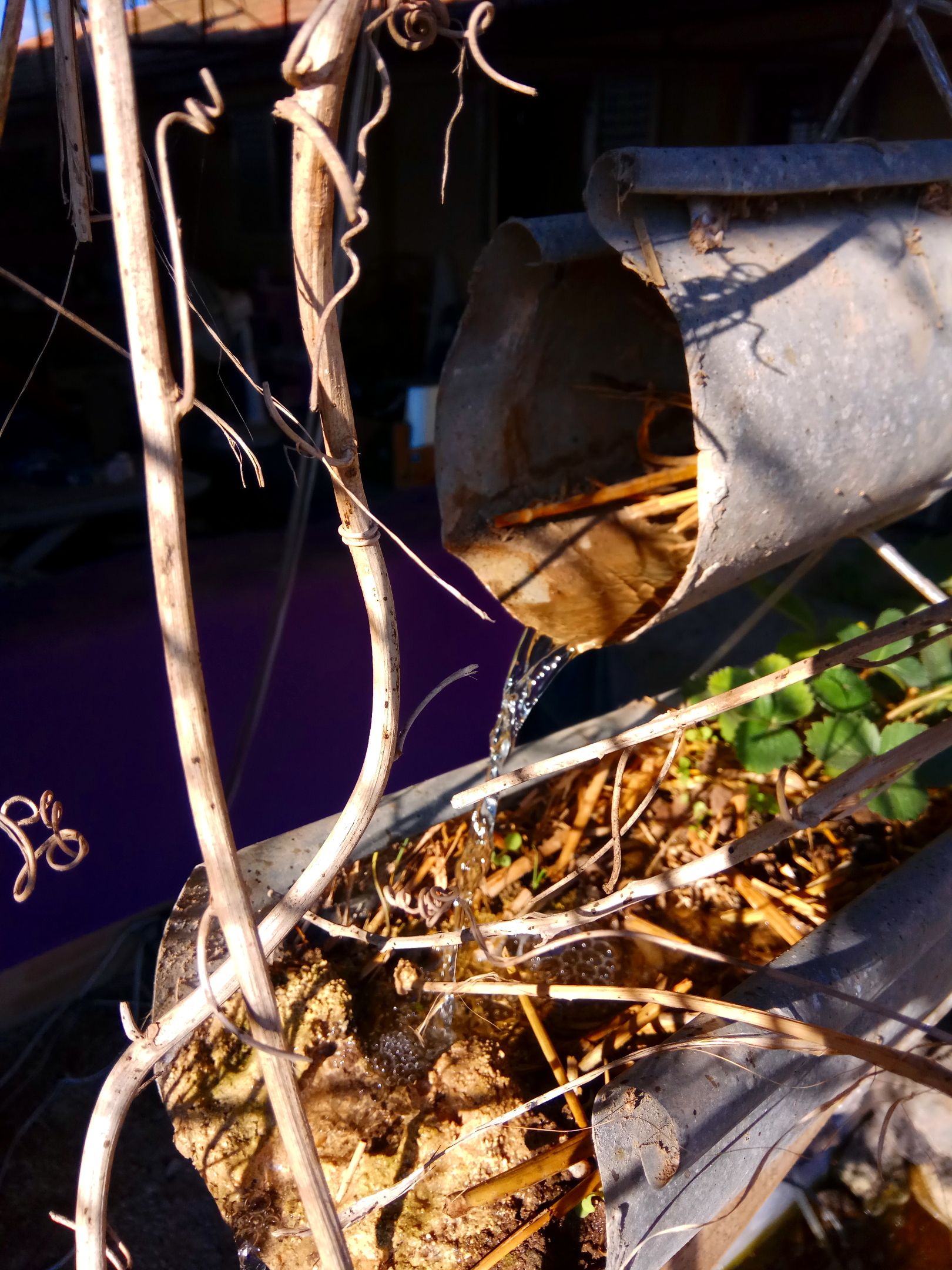 Having a few pieces of an old metal gutter around, I figured it'd be nice to hang a bounch of them up, in a way that water from the top could run through all of them, in nice little waterfalls, and right into a big plastic pond, to be sucked up again with a small water pump.