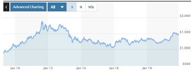 Yet, when we look at this catastrophe, gold went from about $1,000 to $1,400 over the course of the decade. This is a decent return but in light of the easing that took place, it looks like something is amiss. How do the likes of Peter Schiff, a perennial gold bug, claim we will get to $5,000? The truth is this is dependent upon a collapse in the dollar.