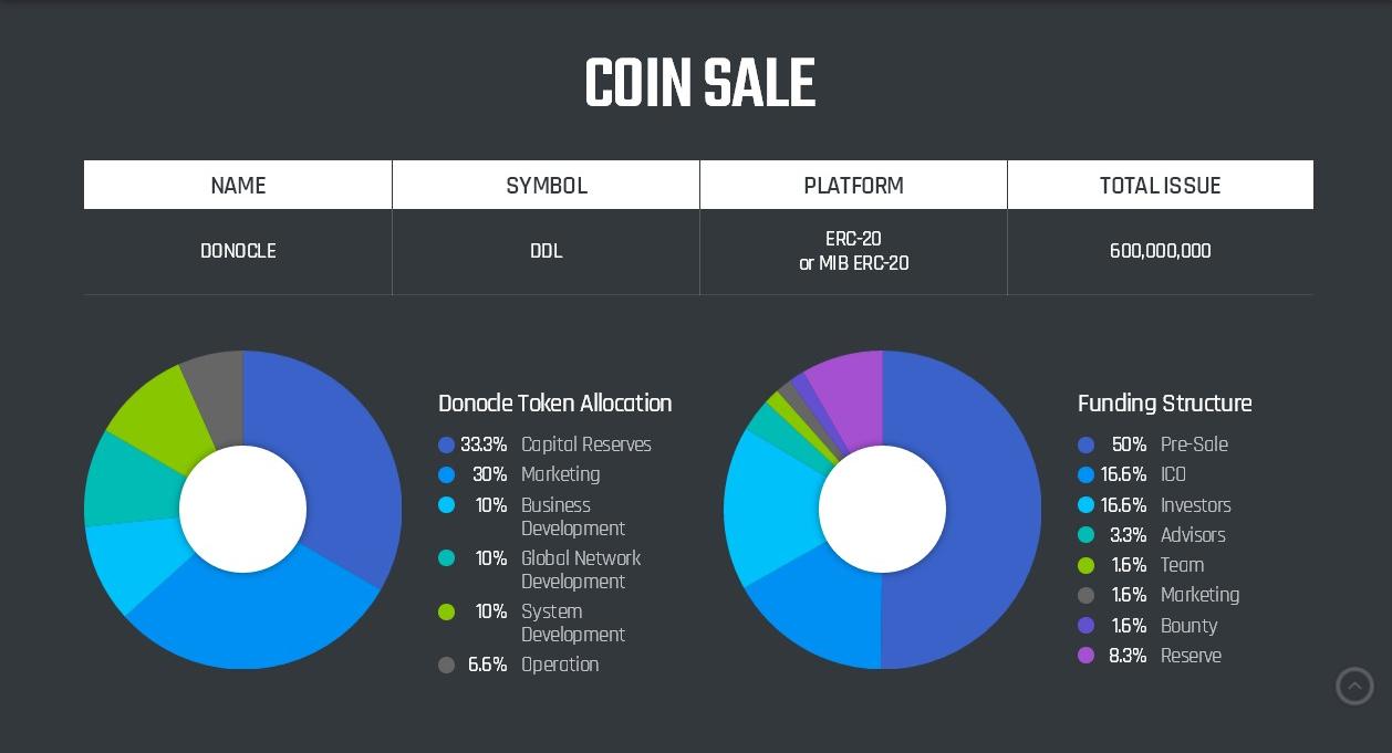 DONOCLE plans to sell 50% of all its tokens at the pre-sale stage. The remaining tokens will be sold at the ICO stage, distributed among investors, advisers, team, spent on marketing, allocated for the bounty program. 8.3% of all issued tokens will remain in the DONOCLE company reserve.
