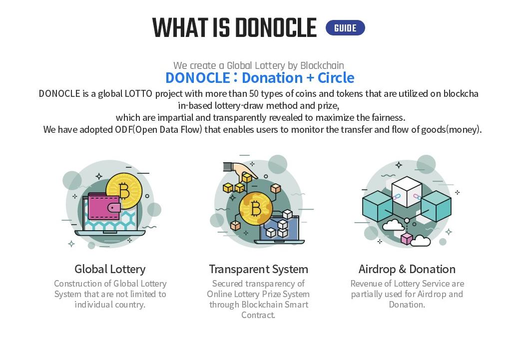 DONOCLE is an online lottery system that uses Bitcoin and Altcoin as material values. At the initial stage of the platform, it is planned to use 50 types of coins and tokens.