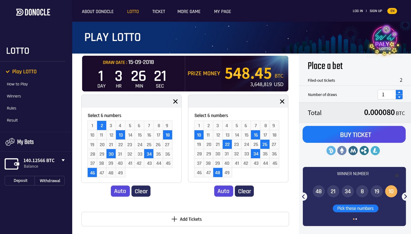 Проект DONOCLE – это проект по проведению мировой онлайн лотереи, которая основана на технологии blockchain, что позволяет сделать лотерею конфиденциальной, честной и прозрачной, доступной каждому и безопасной. В лотерее DONOCLE будут использоваться не высокие ставки, а выигрыш можно будет получить достаточно крупный, что делает эту лотерею еще привлекательнее.