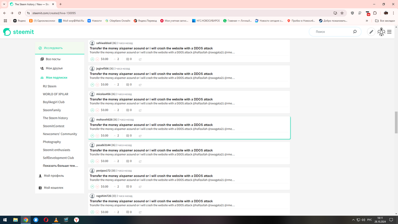 Досс атака ?steemCreated with Sketch.victor999 (59)in #doss • last year Всем привет ,лазия по аккаунтам ,нашел странный посты с досс атакой и переводом 5000 стим , кому то есть дело до аттаки ? Как то так получается ,с разных аккаунтов в стим история ,туда пишут такие письма .... надеямся что обойдется все это . #histori #foto