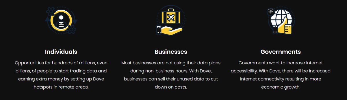 The decentralised platform will not only allow for individuals to sell their excess data for Dove tokens, but also businesses and organisations to sell access to their internet hotspot for a second income stream which will make their operations more financially feasible. Turning internet access into a tradeable commodity will enable monetisation and internet access opportunities like never before.