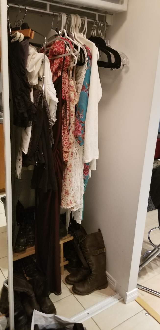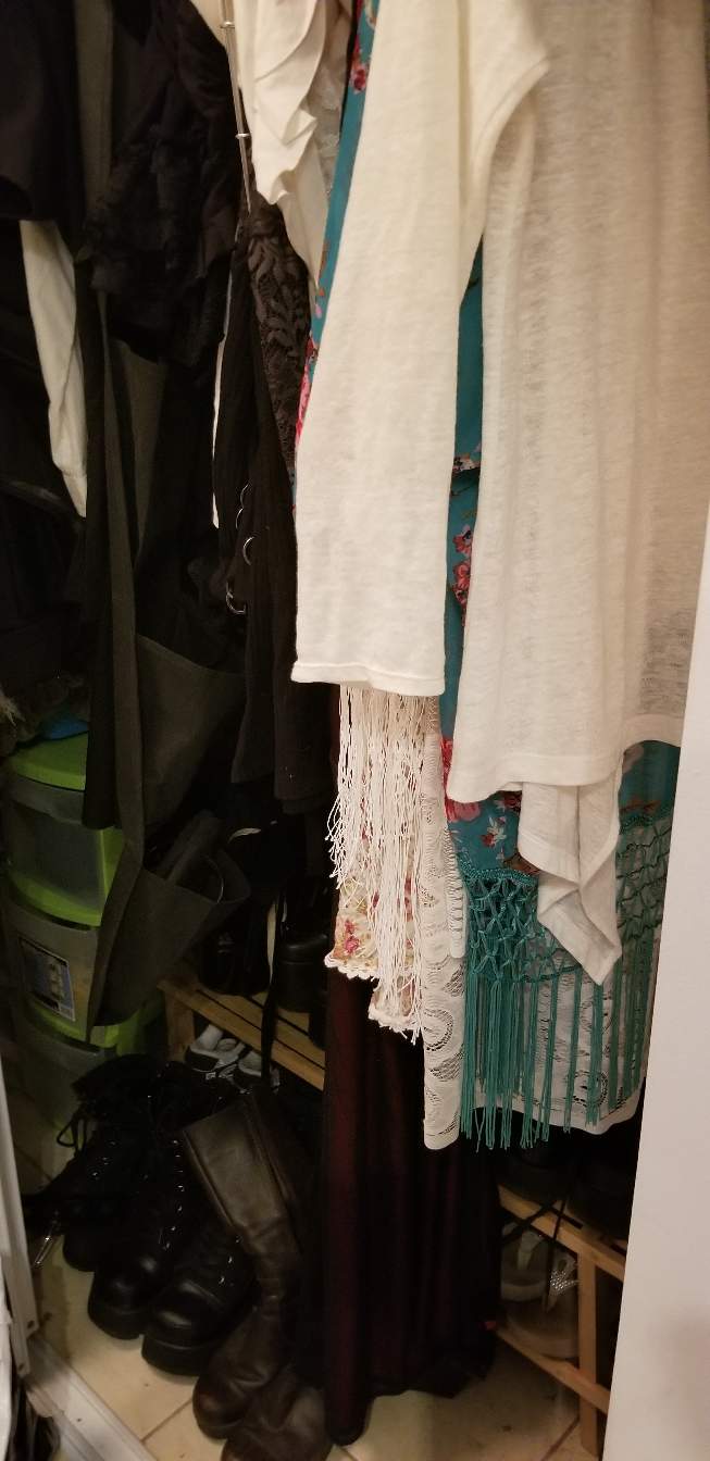 And here's another photo of my new closet! It's so nice to have space in my drawers and closet again. Not to mention, I've also downsized my enormous boot collection. I do still have quite a few shoes and boots, and I will indeed slowly be parting with many of them before its time to move west.