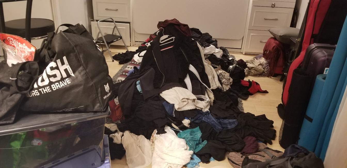 Yesterday I began with clothing. Here's my before pile, all of the clothing that I own except for undergarments and socks that I dealt with first. That includes the contents inside those bins and tote bags.
