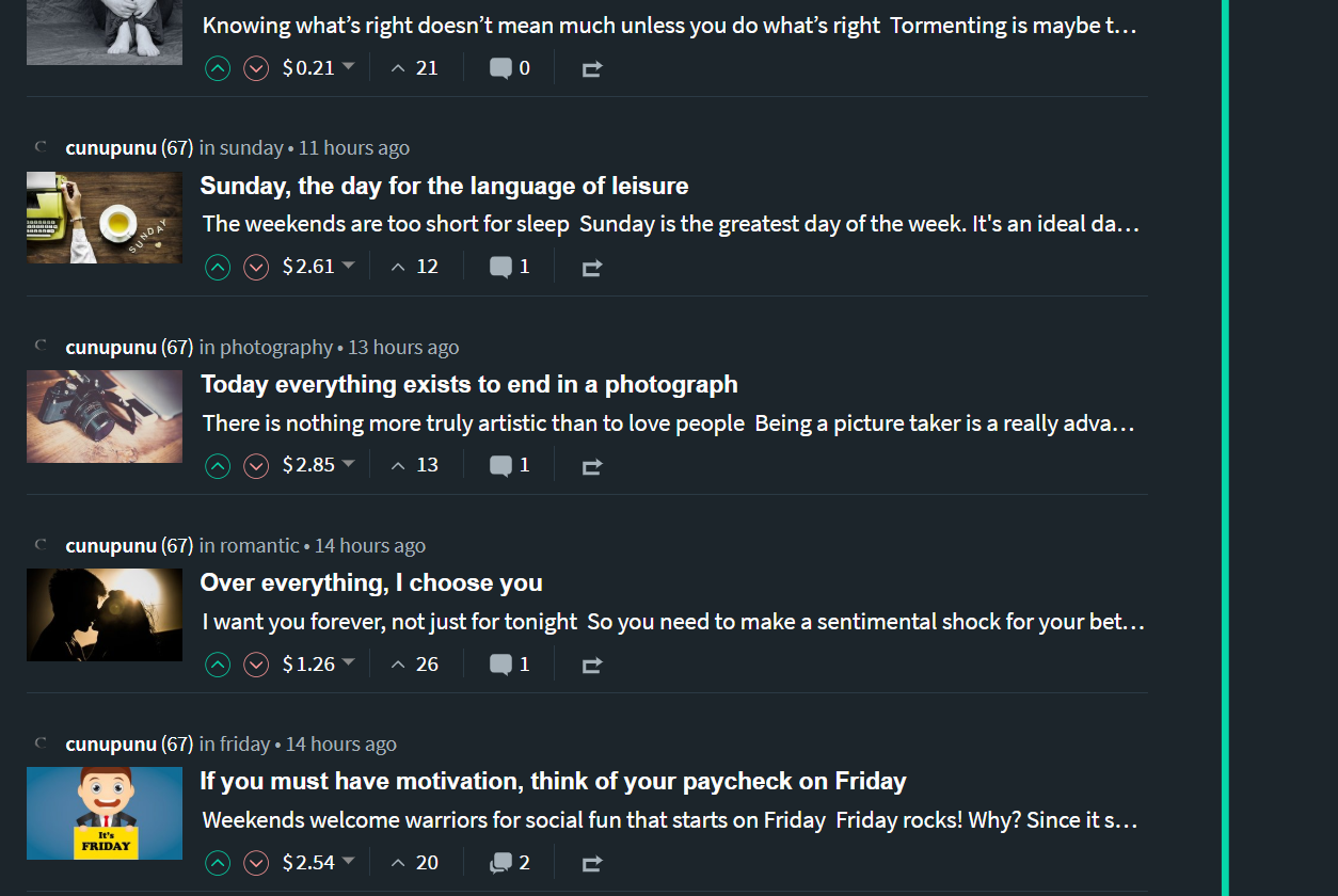 At first glance this account doesn't look that bad, but it posts 10 -12 times a day... uses late votes from the bots to have all posts up to around $7 dollars per post.