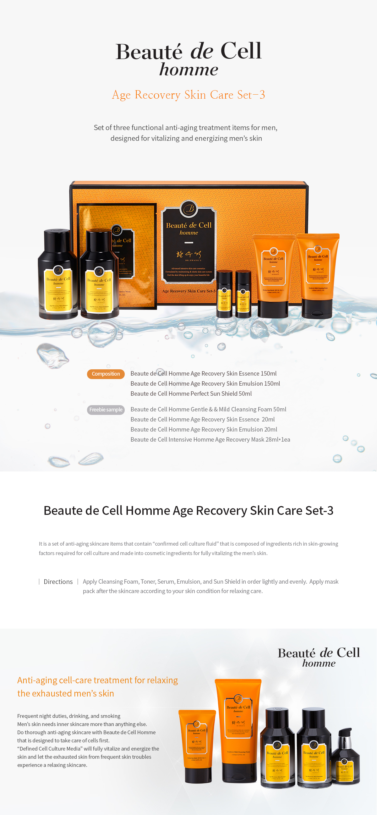 Beaute De Cell Homme performs thorough refreshing skincare based upon the differentiated cell science technology designed for comforting and relaxing the skin from the inside. Also contains advanced NT1 patented and industry approved technologies, used to transport and encourage growth to stem skin cells with Nano liposomes helping to penetrate the bodies skin cells to deliver to existing deteriorated cells, therefore regenerating and rejuvenating