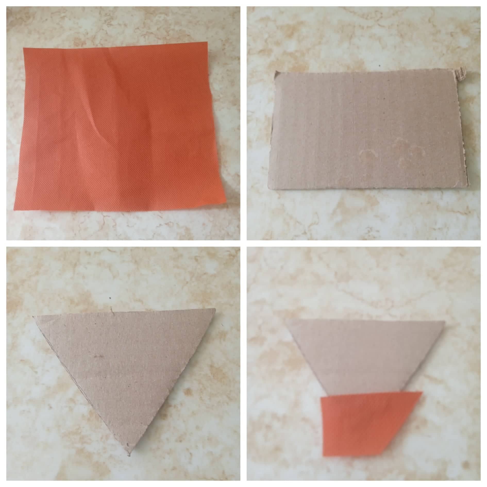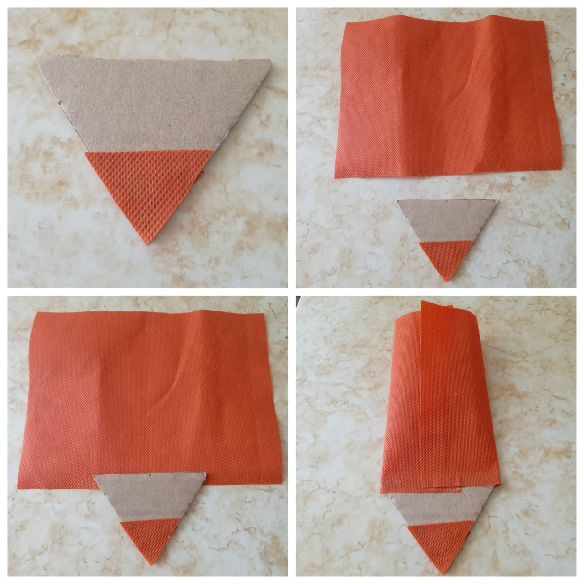 Una vez forrada la punta del color, procedo a pegar la tela previamente cortada con esta forma triangular para así formar nuestro cotillón en forma de lápiz de color.