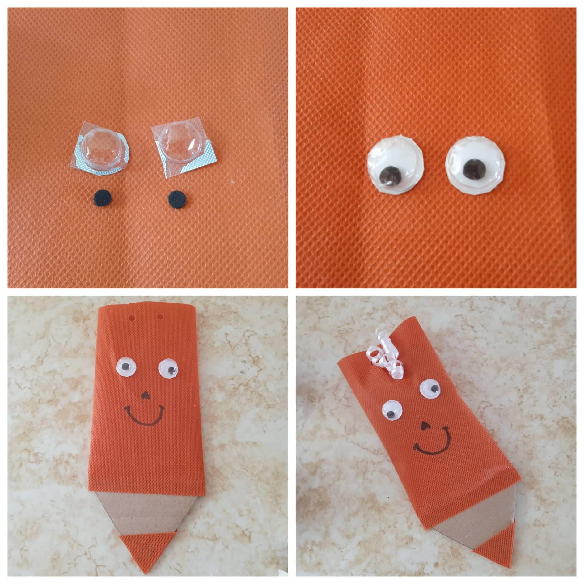 Una vez armado este cotillón en forma de lápiz de color procedo a decorar utilizando el estuche de las pastillas para realizar unos ojitos y por ultimo con un marcador le realice la boca y la nariz, para cerrar abrí dos huecos con abre hueco y le coloque la cinta cilabel.