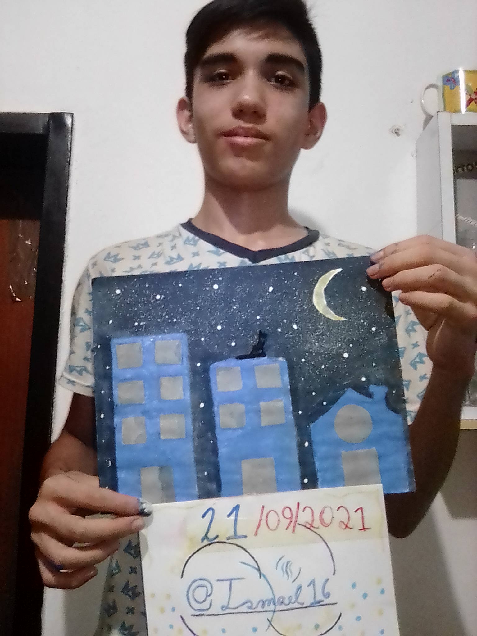 Buen día, tarde o noche amiguitos de steemit, en especial a @Deisip67, en esta oportunidad les voy a presentar la pintura que hice para este concurso, para hacer la pintura me inspire en una costumbre de mi gato mascota que se sube al techo del edificio todas las noches a ver la luna y ese es el paisaje que veo con el todas las noches, espero que les guste mi participación para el concurso y lo disfruten mucho.
