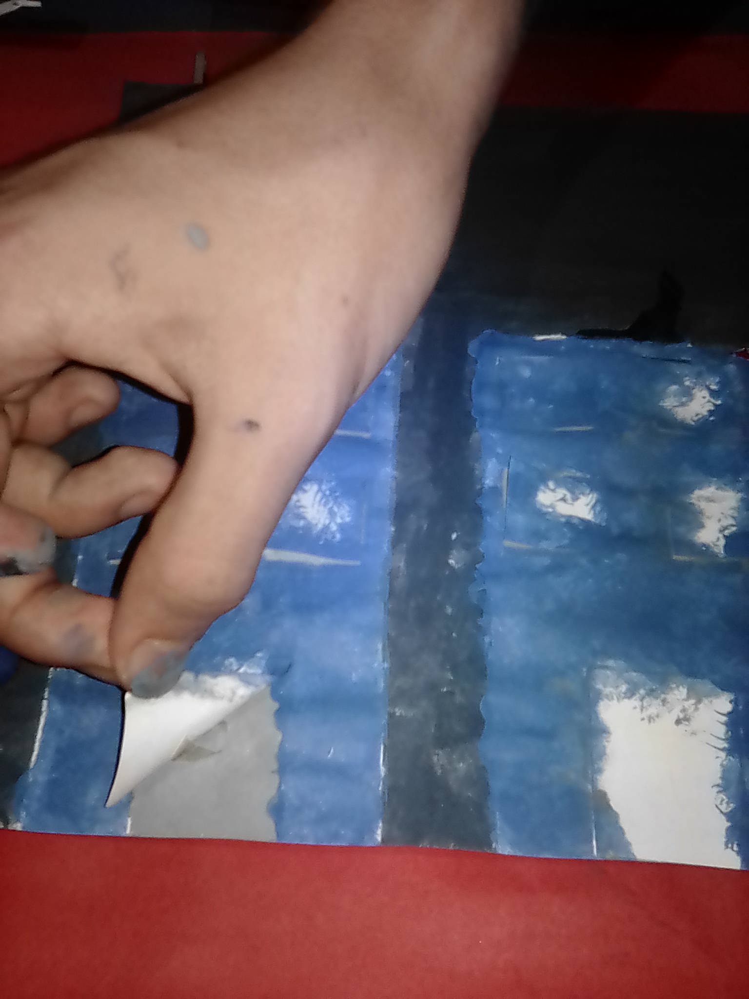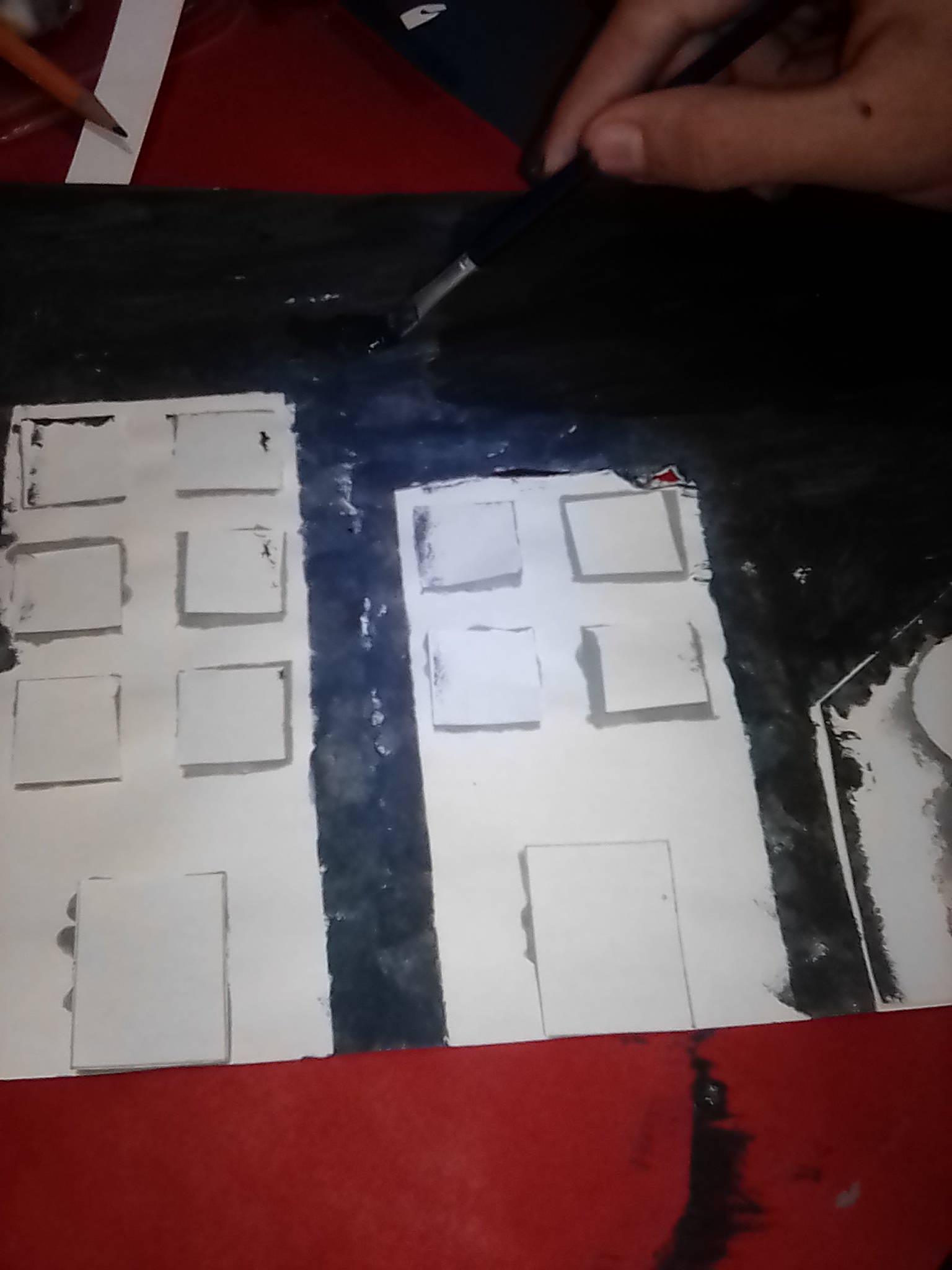 Paso 6:Despues coloco los recortes de los edificios en su lugar para no manchar el papel, y me dispongo a pintar el fondo con pintura azul oscuro.