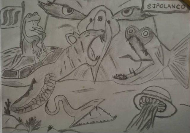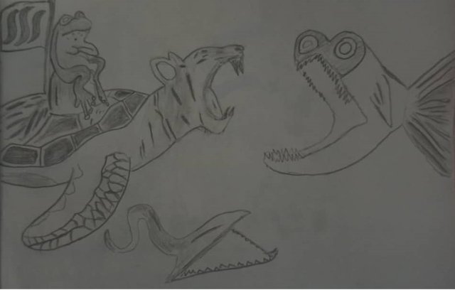 Mientras la Rana Reina de Sudamérica "LAICAN" cabalga en su Tortugas Tigre "LUCAS" , llevando su estandarte de batalla de las Tres tribus de del mundo actual , la Piraña Búho enviste contra ellos mientras las demás especies observan el destino final de las especies.