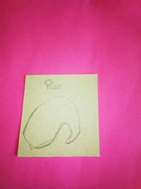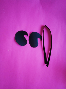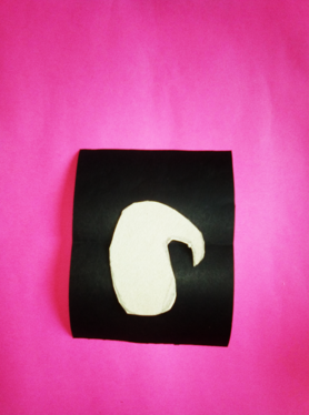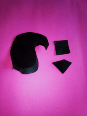 Dibuje la silueta de un pico de ave para formar un patrón, este lo use como guía en una cartulina negra pintando la silueta y así poder recordar 2 piezas, también corte una tira para unir las dos caras con pega blanca formando parte del pico, con la misma cartulina corte un cuadrito y uní las punta en forma de pañuelo, y así formar el pico completo.