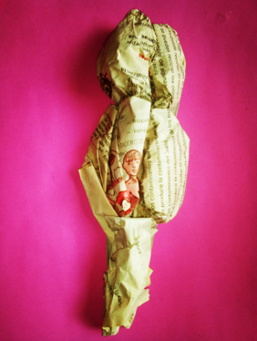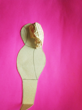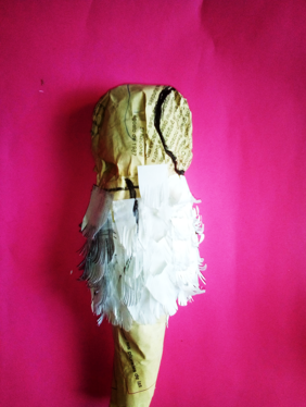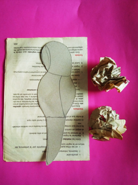 Utilice el patrón del ave que tenia previamente hecho con sus divisiones dibujadas para tener una idea de como podía colocar las piezas, luego con papel realice pequeñas envolturas y comencé a pegarlas con pega blanca cubriéndola por completo en ambas caras, por ultimo use papel de periódico para forrarlo y darle una apariencia mas lisa.
