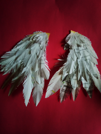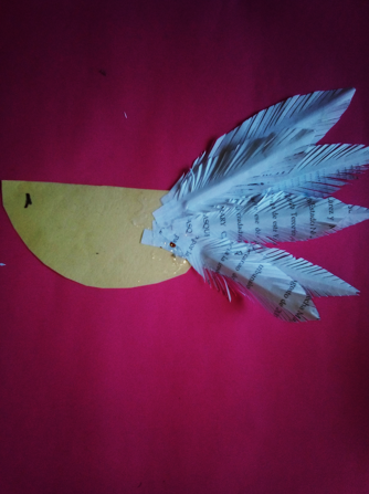 recorte dividiéndola a la mitad, para luego ir colocando las plumas unas grandes y otras mas pequeñas cubriendo por completo las alas.