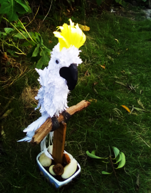 Ya lista la cacatúa con materiales reciclado decidí colocarla en una madera que fue colocado en un envase plástico rellenado con rocas y asi quedo mi cacatúa.
