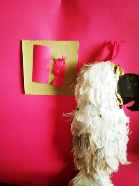 Coloque plumas en la parte baja del ave para darle forma a la cola, después corte pequeñas tiritas de color fucsia y se las coloque en la parte de arriba de la cabeza.