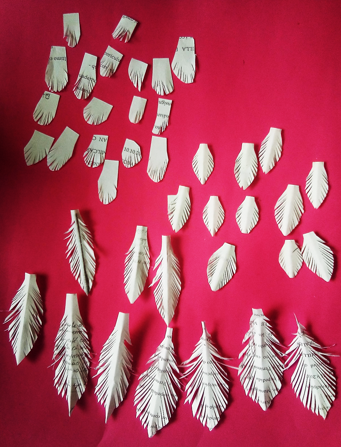 Corte las plumas de diferentes tamaños, primero usando una hoja blanca, dibujando la formas de hojas de diferentes tamaños, para luego darles pequeños piquetes en los extremos de cada una y así darle efecto de una pluma de ave.