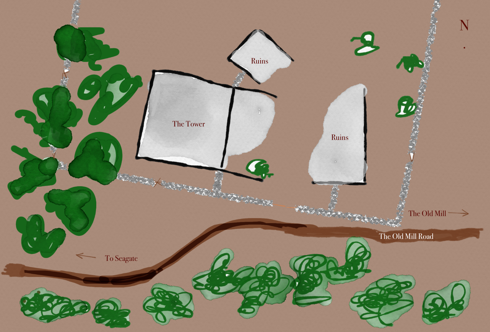 The tower, situated about 12 miles east of seagate along the Old Mill Road has a reputation in the town as a creepy, but harmless and empty ruin. No one knows the reason why the top two levels have been sheared off, or how it came to pass, knowing only that the power needed to achieve such a thing means mighty magics must have been involved - but whether on the side of evil, or of good, is an ongoing source of debate.