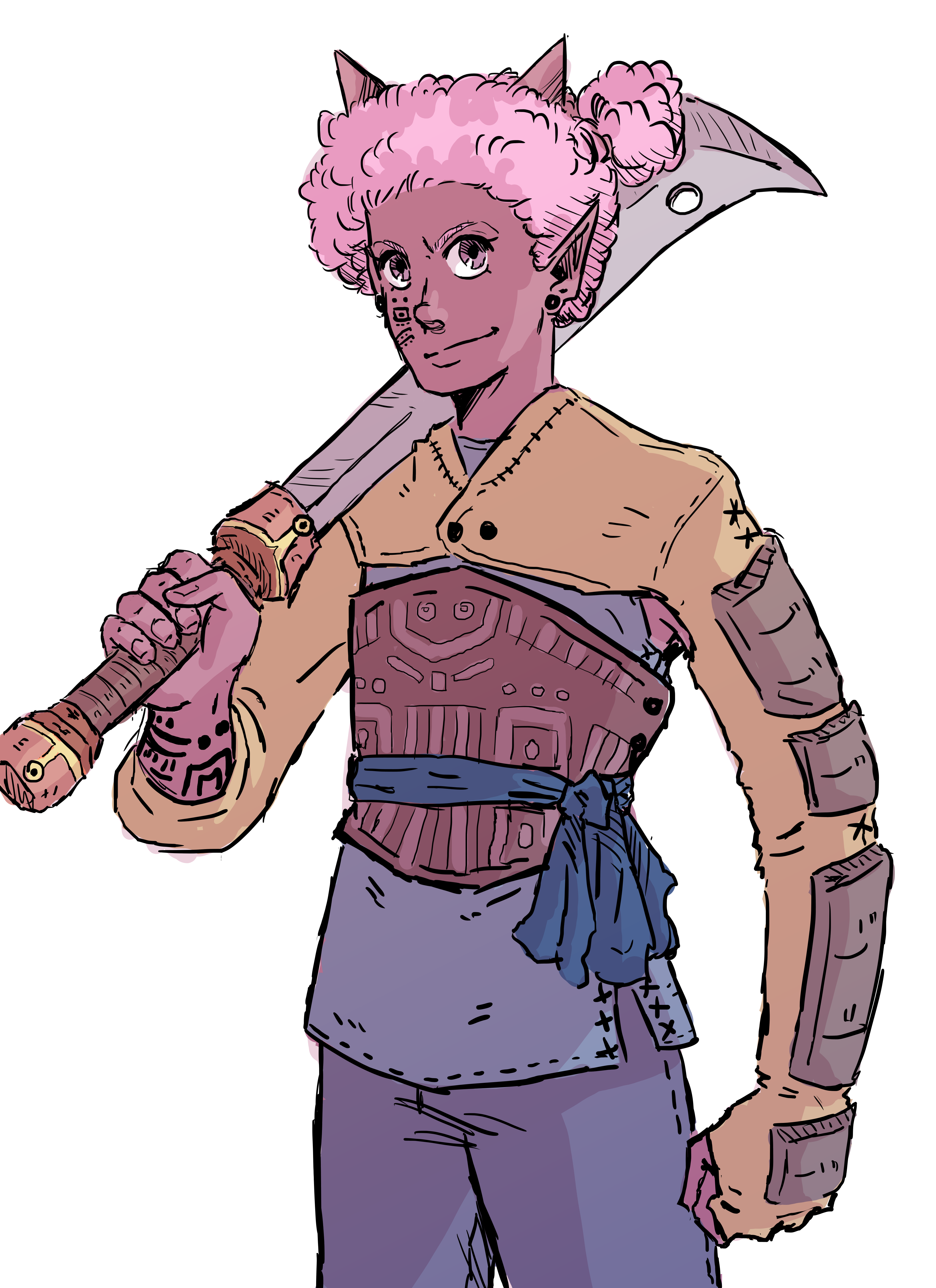 love her, barb! good and confident pose, and the colours are really cool ! love the pink hair and the horns !! and her weapon is super ! i love her <3