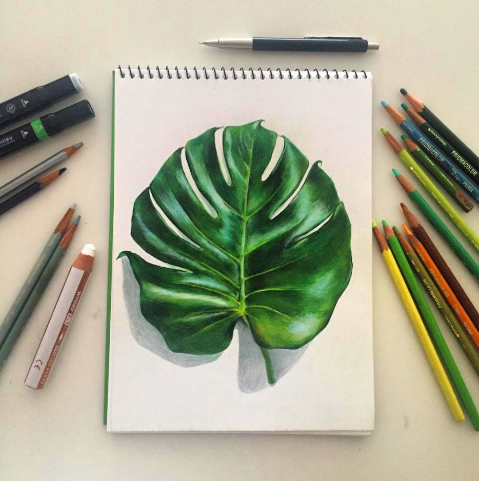 샤프, 마커, 색연필을 이용하여 그려본 '몬스테라 잎'.
