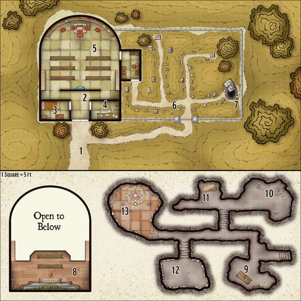 Terrain. The church and graveyard are surrounded by grassy hills and a few trees. The church is on high ground and the nearby town is visible from its doorsteps. The floor inside the church and the ritual room (Area 13) feature well-preserved stone tiles. The floor in the crypts is rough but even. Squares partially occupied by a piece of furniture or object are considered difficult terrain.
