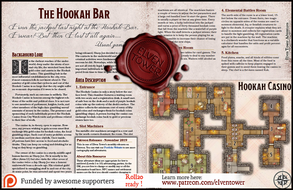 These are the general features of the Hookah Casino. It is located underground in the busiest quarter of a metropolis. The only entrance is in a quiet alley, an unmarked door flanked by two ogre bouncers.