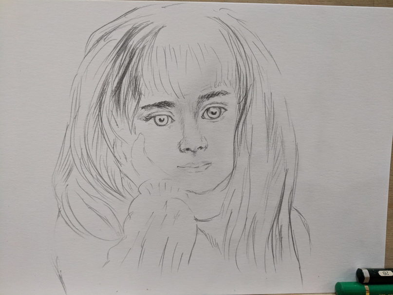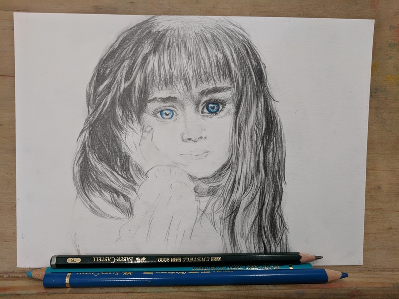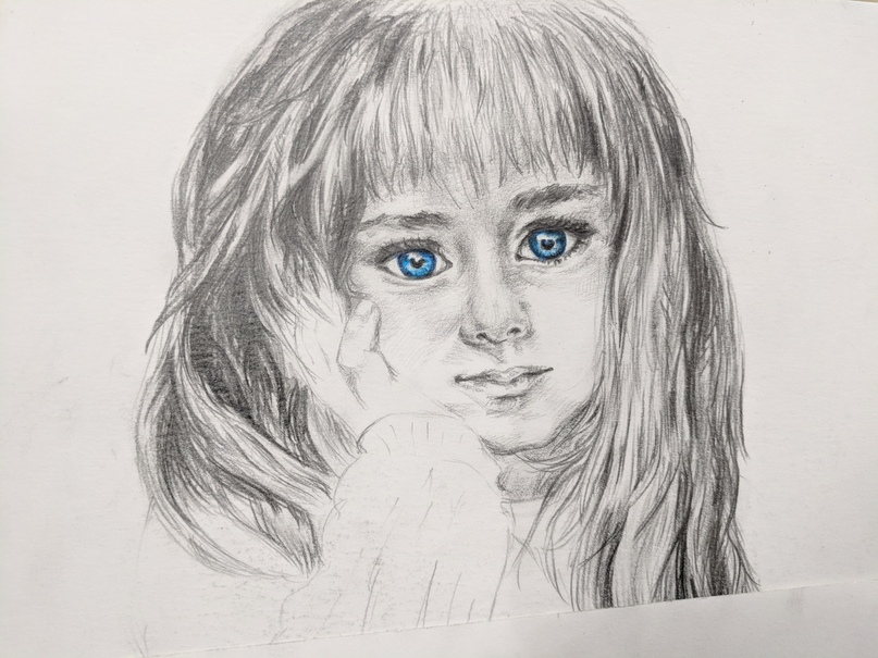 This is my pencil drawing, I drew a portrait of a little girl. I really like to draw people, especially portraits of children, because they have real emotions. I'll show you the step-by-step process of drawing. I sketch with a pencil, draw eyes, a rounded face, lips, wavy hair. The girl's hand is pressed against her cheek. The child has large expressive eyes. I decided to draw them with a blue pencil to make them brighter.