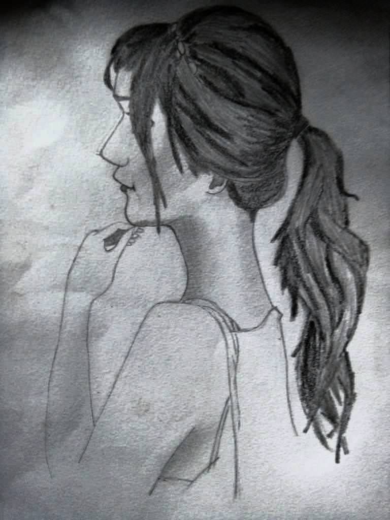 First, I sketched using circles and other figures. Honestly, I don't really know how to sketch. Portrait drawing is the toughest thing to draw for me. After that, I drew the face part of hers and then I tried to do the hair and the neck to her shoulder and back.