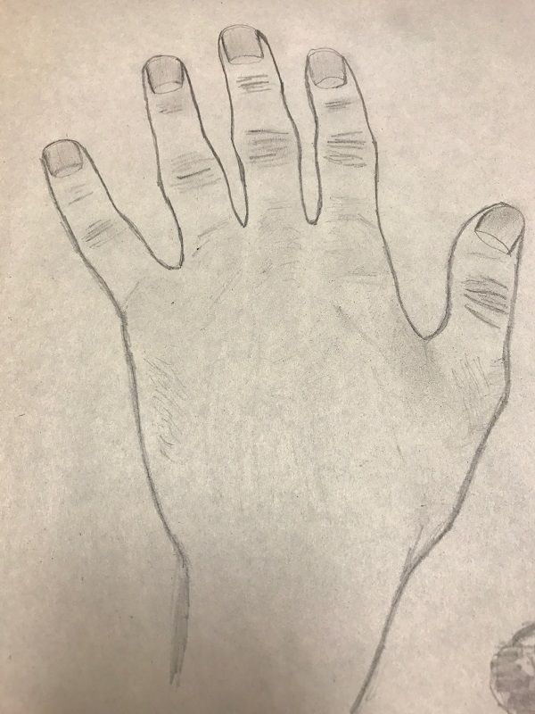 Next, we were asked to draw our hands. I decided to draw my hand from above, and used the shading principles to create lines and areas of depth. It really requires more time than the 40 minutes given for this part of the exercise, but it came out better than I thought it would.
