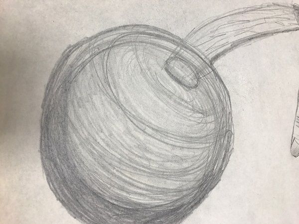 Next, we applied the shading methodology to draw a complete sphere. We started with a circle drawn on paper. We chose a spot in the circle to "shine a light upon" and drew lighter circles around that light, and as we moved away from that spot, we pressed harder on the pencil to shade darker those areas further from the light, creating a sphere. I chose my sphere to be a cherry and added a stem. It's definitely a rough sketch, as I am still learning to press on the pencil with different pressures.