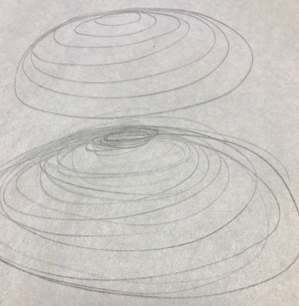 Then we drew continuous concentric circles where one side received heavier pencil than the other side: (failed on the first try, much better on the second!)