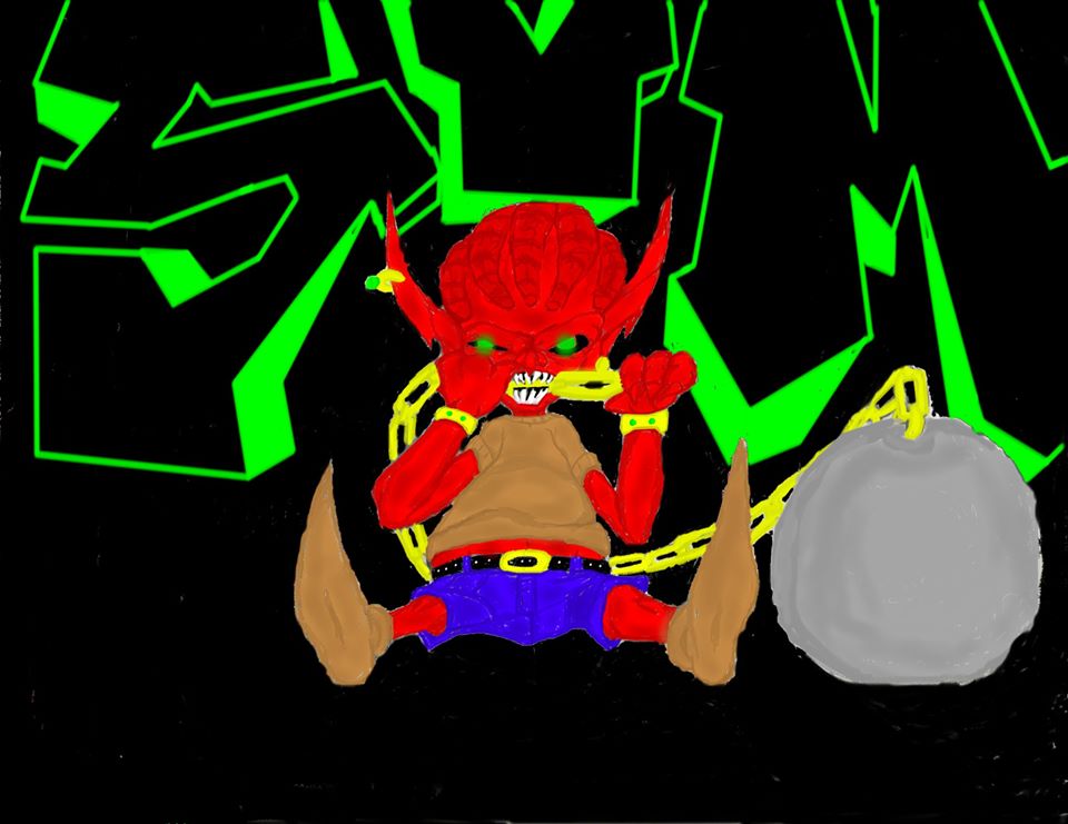 I DID THIS WHILE THINKING OF THAT OLD SCHOOL MOVIE GREMLINS ALWAYS LIKED THAT FLICK BUT I DIDNT JUST WANT TO DO THE SAME KINDA OF MONSTER LIKE IN THE MOVIE SO I MADE THE CHARACTER RED INSTEAD OF GREEN THEN ADDED MY GRAFFITI NAME TO THE PICTURE AFTERWARDS