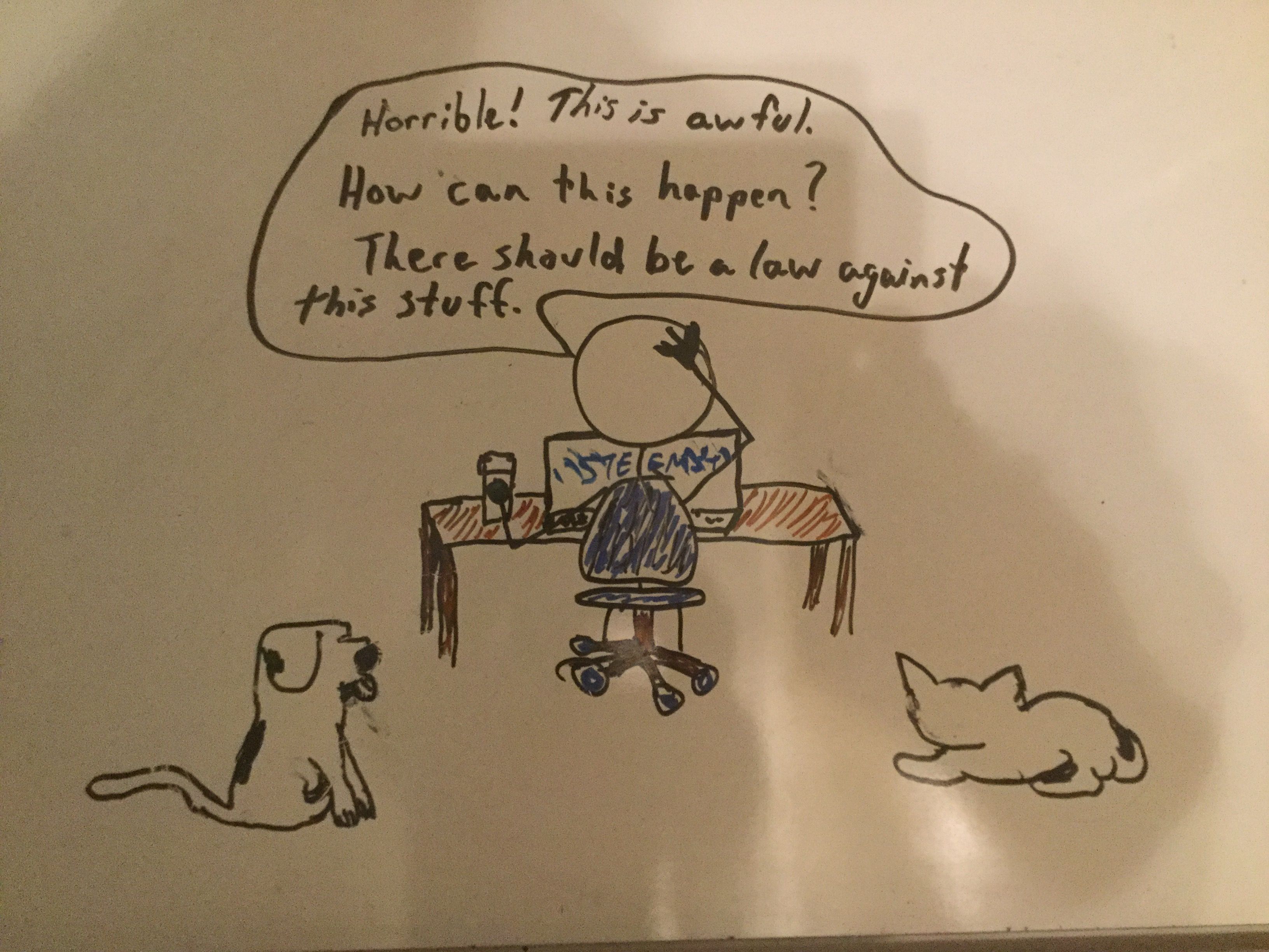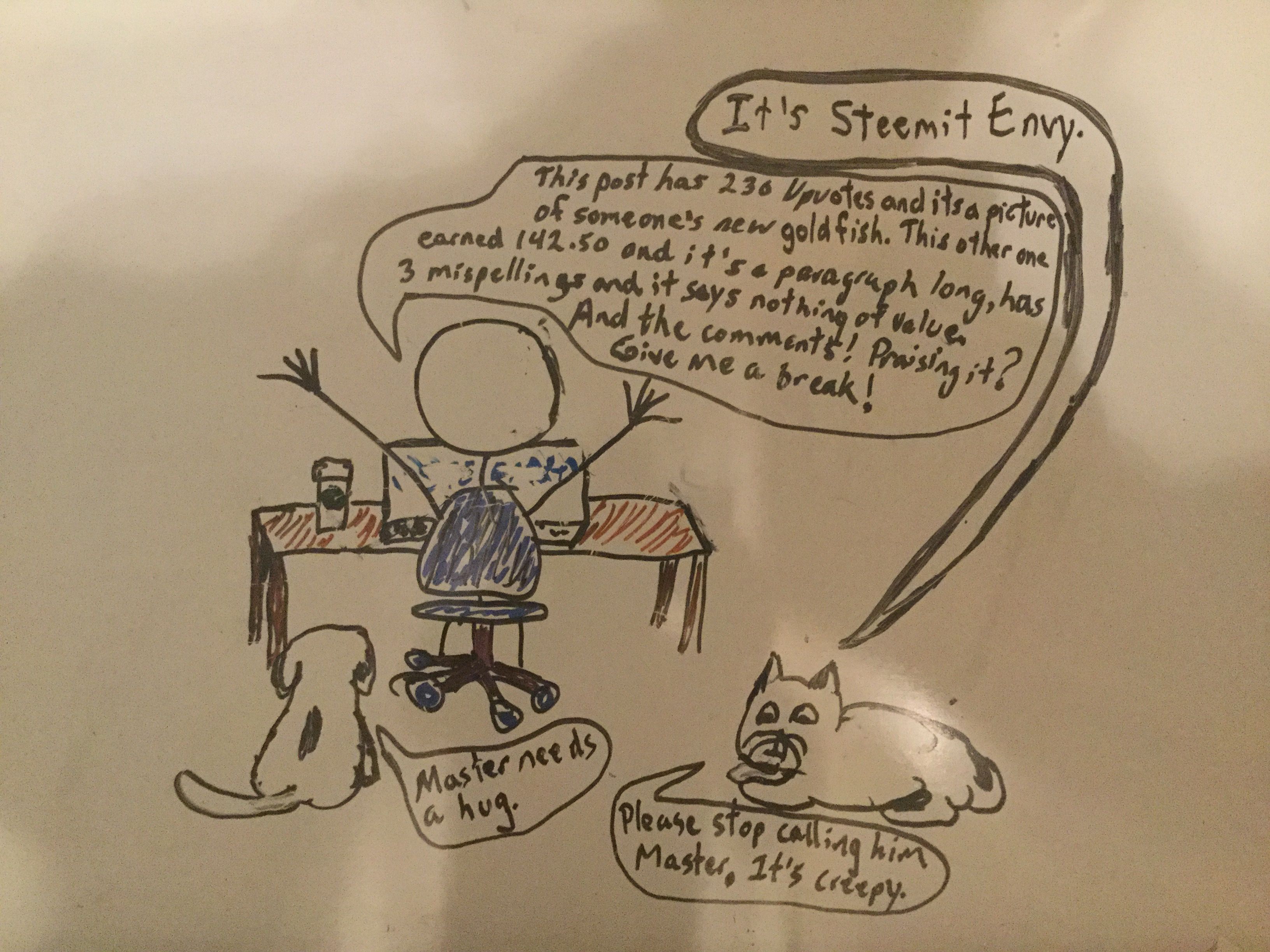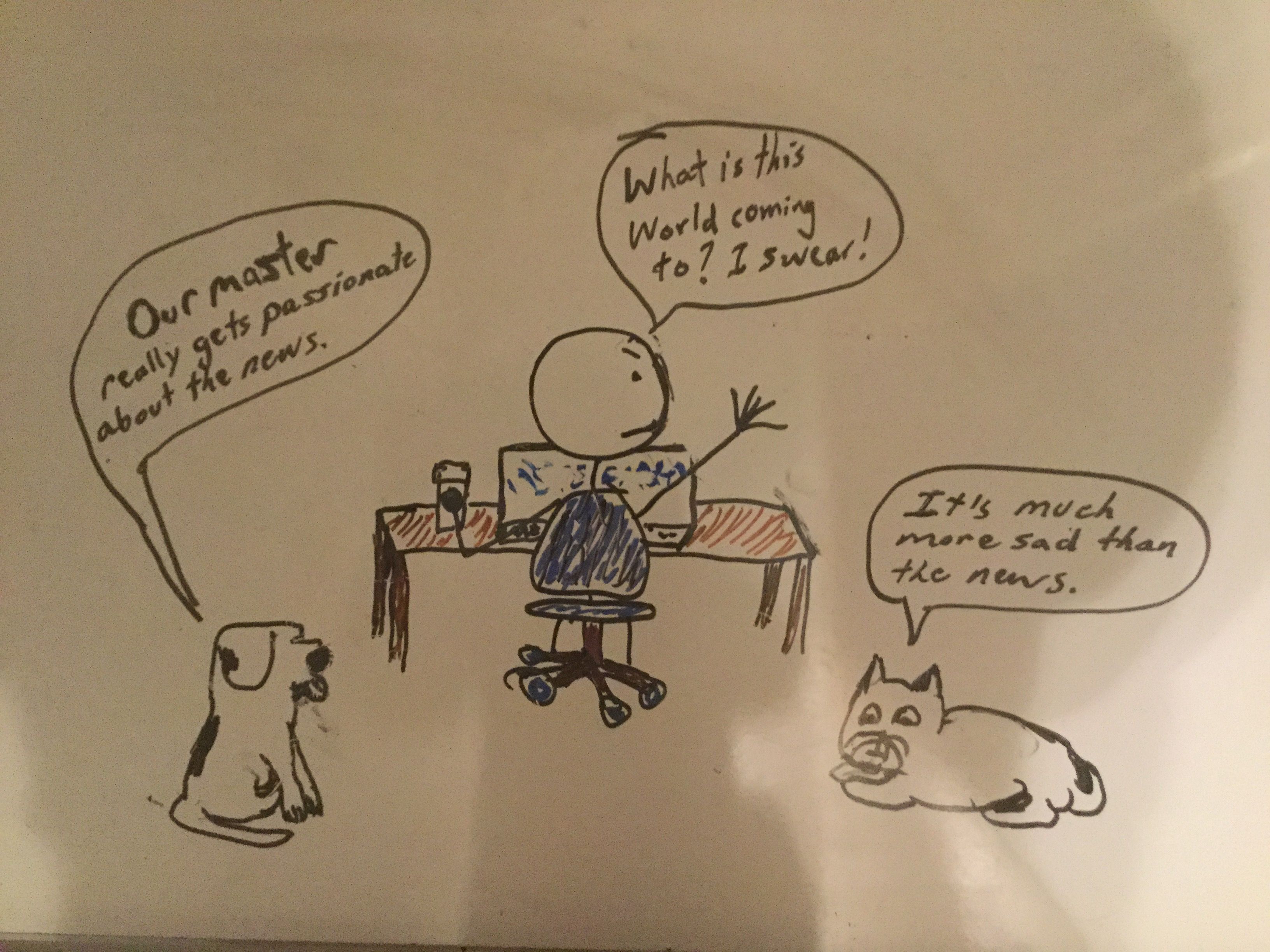 Well, at this time, I'm using a marker board so I can easily erase mistakes. And I too am discovering composition issues with the thought bubbles and character positioning. You can see that in this one I had to awkwardly stack them because I was trying o get the reader to notice the dialogue in the order I intended. This is not an easy art form. It's even different than story boarding and comic book panels. I have an idea of what I want to say, then I start drawing the character whose position and emotion I have the clearest image of in my head.