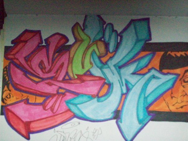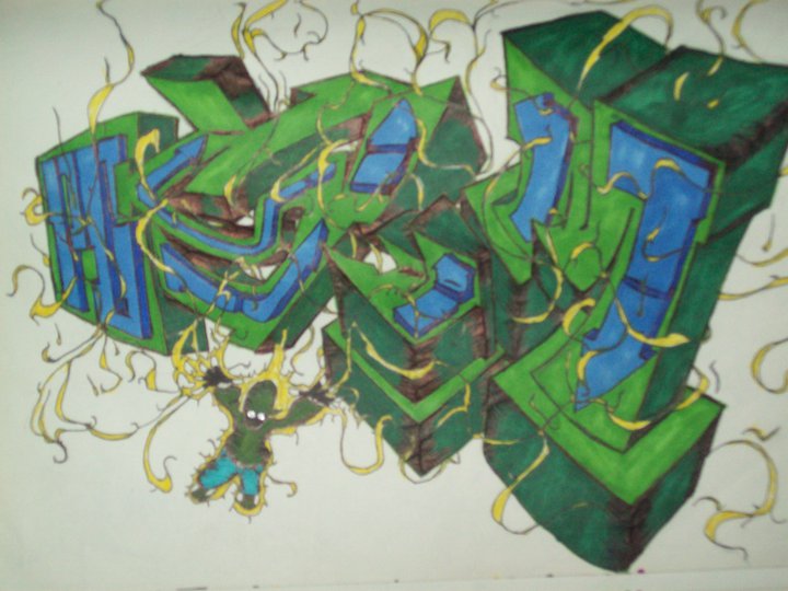 HERES 2 DRAWINGS WITH MY NAME IN GRAFFITI I LIKE DOING 3D STYLE GRAFFITI CAUSE THE LEVEL OF CREATIVITY YOU CAN DO WITH IT IS ENDLESS ALL YOU GOTTA DO IS HAVE A GOOD IMAGINATION I USED BRIGHT COLORS IN THESE PICTURES SO THEY CAN STAND OUT LOOKS GOOD WITH ALL THE COLORS AN REALLY POPS OUT