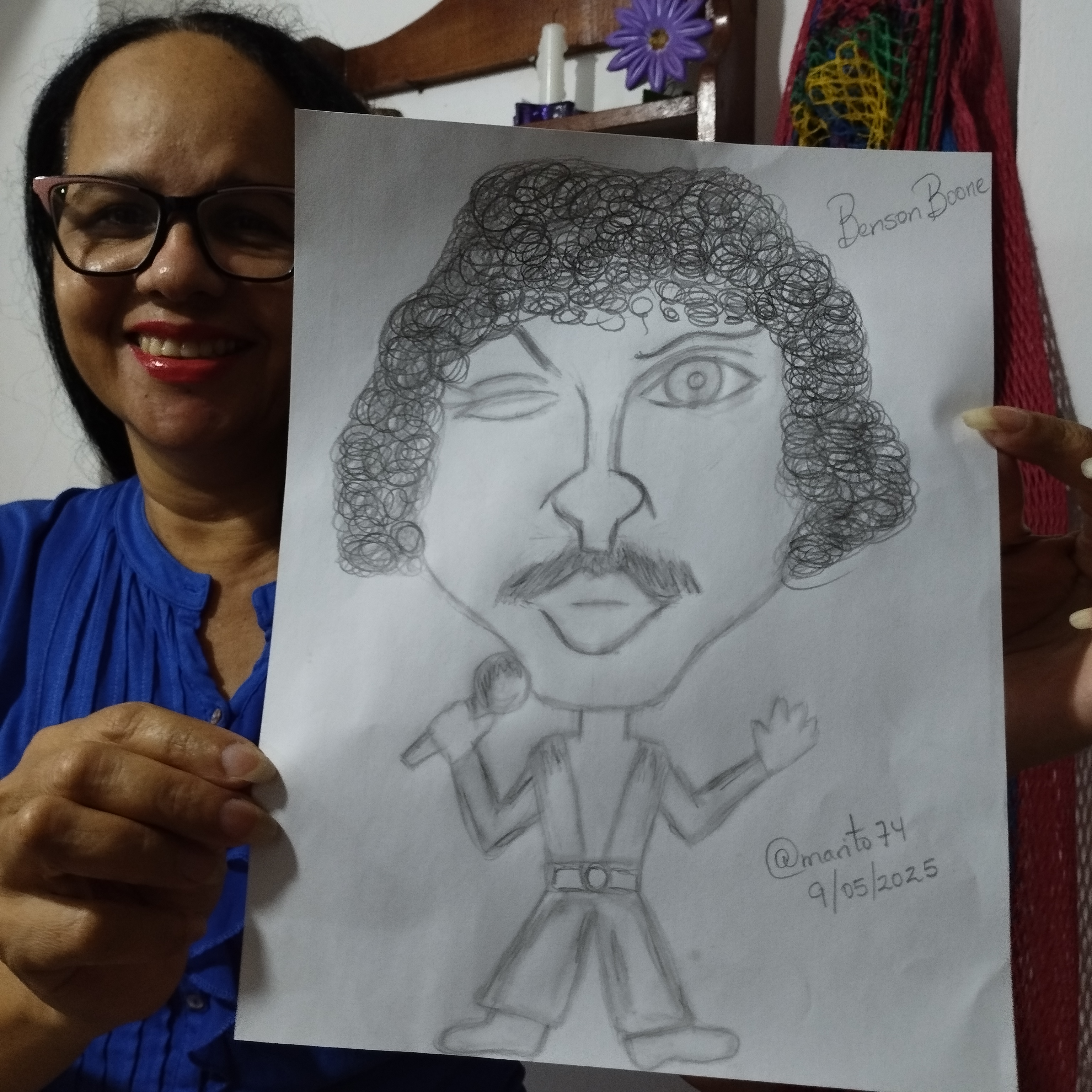 Actualmente hay un joven cantante super talentoso llamado Benson Boone, este chico tiene un carisma y talento vocal increible, sus rizos son super llamativos al igual que su bigote, por lo general usa trajes ajustados en el escenario, le gusta realizar piruetas. En mi opinión es encantador, sexi y coquetón, soy una fan más y esta es su caricatura, usé un lápiz 2B, un hisopo y hoja blanca.