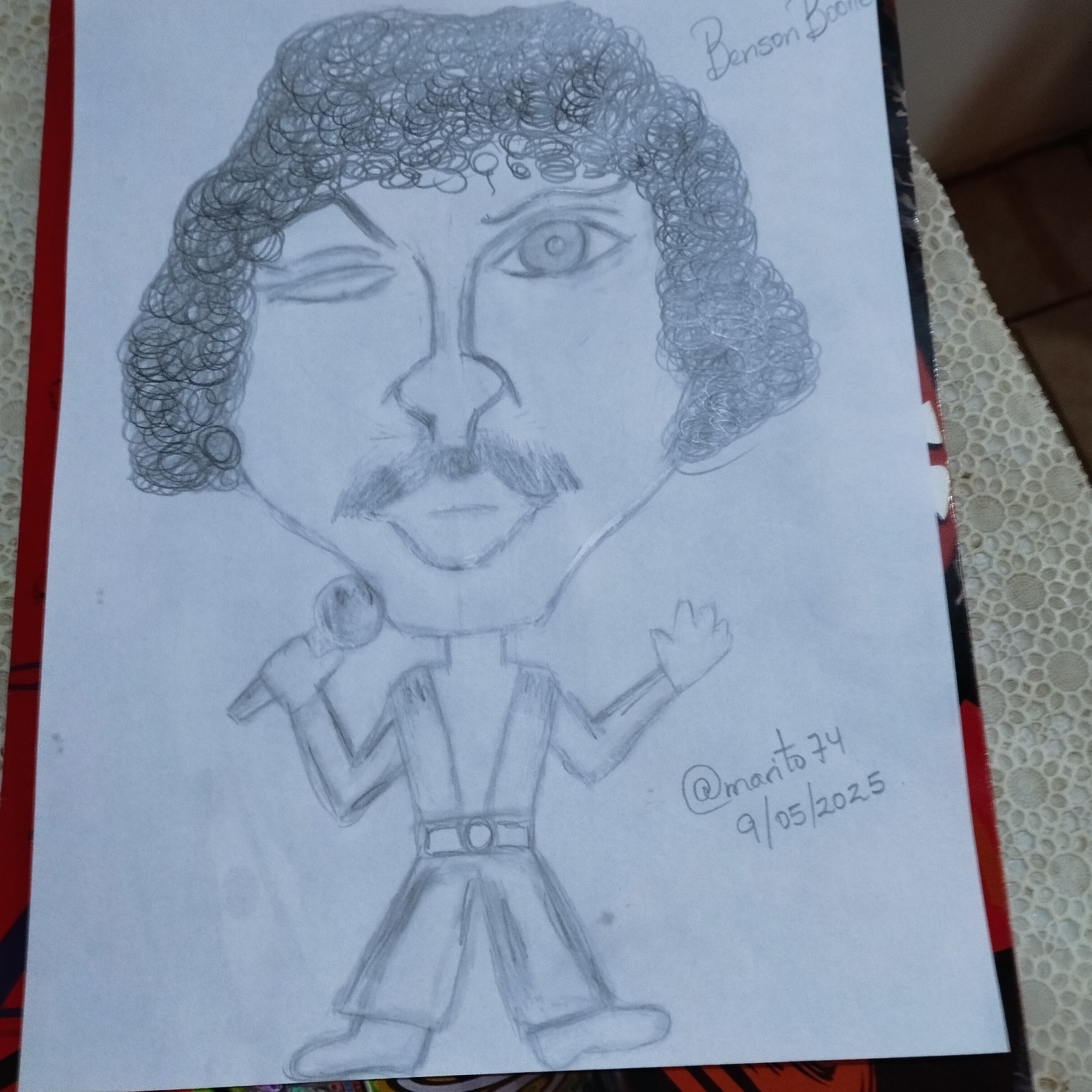 El rostro agarra más vida, dibujé el otro ojo pero decidí que fuera un guiño, me parece divertido, de hecho Benson interactua en redes, en conciertos con los fans y es muy picarón, así que dibujé cejas con el toque respectivo, una vez ubicados los ojos, le dí forma a los labios, bastantes exagerados pues el los tiene delgados.
