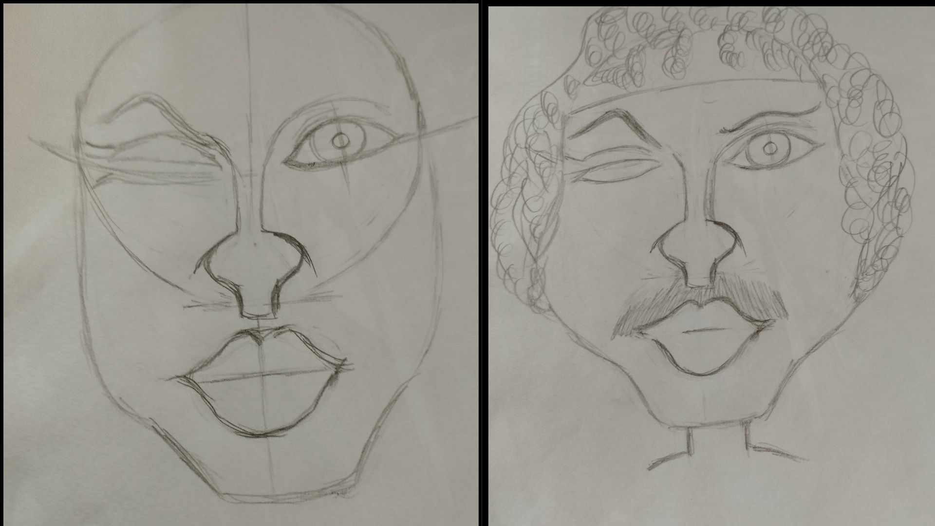 Decidí dibujarlo de frente, entonces tomando en cuenta los ejemplos suministrados por Nuñez, inicié con un círculo, tracé una linea en vertical en medio de este, esta línea abarcó unos cms más fuera del círculo, luego tracé 3 líneas horizontales; cada una de ellas me permitiría ubicar y trabajar los elementos de la cara (ojos, nariz y boca).